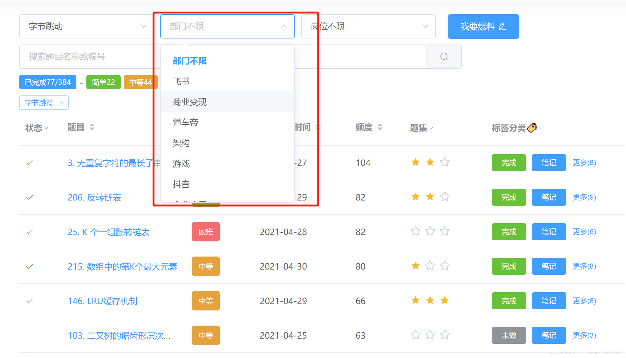 CodeTop已包括字节跳动、腾讯、美团、快手等十余家公司,覆盖100多个部门。