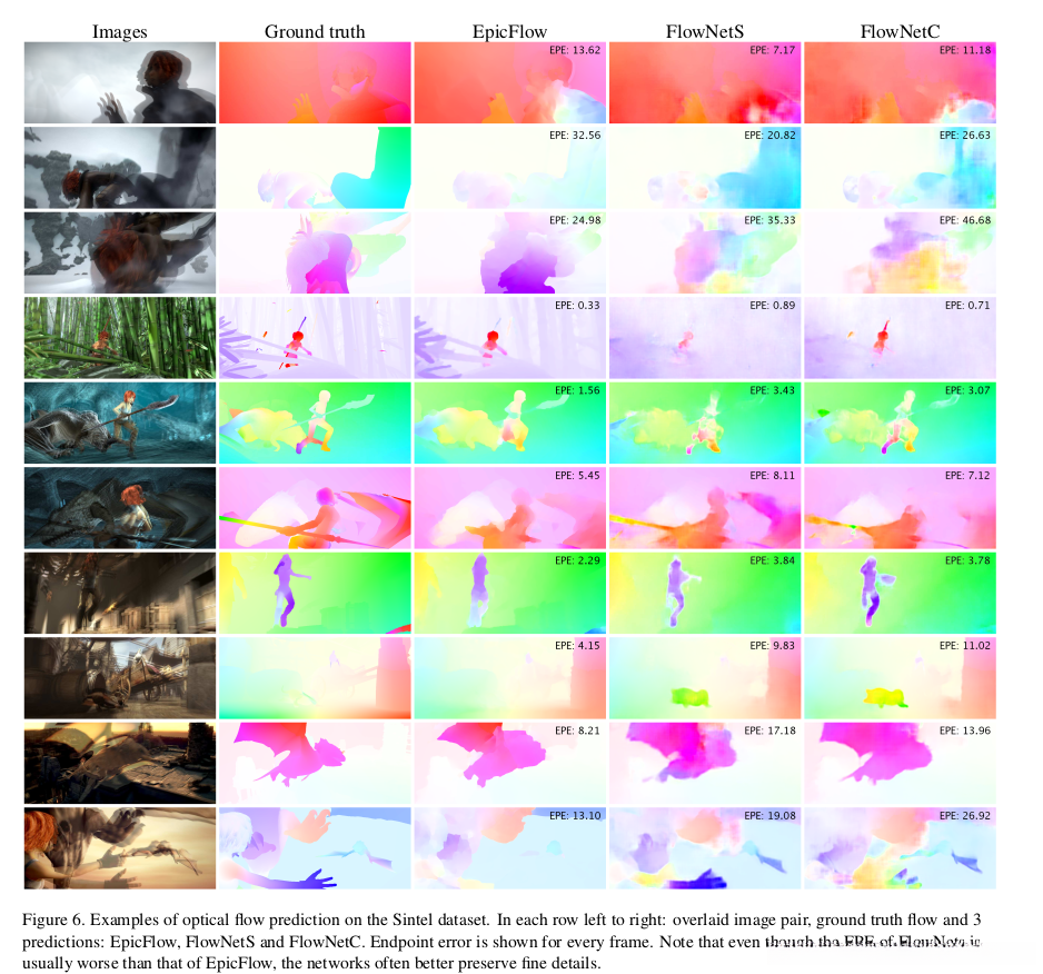 Sintel。从表2中可以看出,FlowNetC比FlowNetS在Sintel Clean上好,而在Sintel Final,情况发生了变化。在这个困难的数据集上,FlowNetS+ft+v甚至与DeepFlow持平。由于平均end-point 错误通常倾向于过于平滑的解决方案,因此我们的方法的定性结果很有趣。图6显示了两个FlowNets(没有微调)所预测的原始光流的例子,与ground truth and EpicFlow对比。该图显示了网络通常如何产生视觉上吸引人的结果,但在endpoint错误方面仍然更差。仔细观察一下就会发现,其中一个原因可能是网络的非平滑输出,尤其是在大的光滑的背景区域。【这里的非平滑输出指的是什么?即指指标EPE更倾向于平滑的图像,而网络恰恰又容易输出不平滑的图像,所以作者想表达的是,网络其实效果很好,只是不平滑】我们可以用变分的方法改进来和部分补偿。