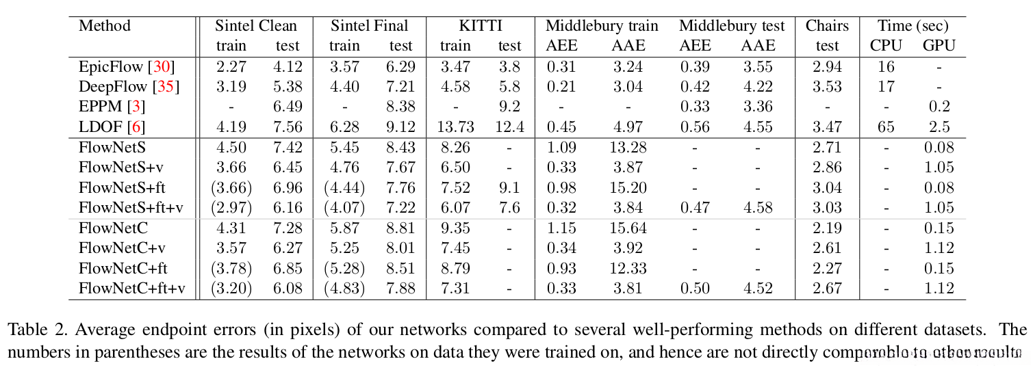 表2显示了我们的网络的endpoint error (EPE) 和公共数据集(Sintel、KITTI、Middlebury)的几个性能良好的方法,以及我们的Flying Chairs据集。另外,我们展示了在Sintel上不同方法的运行时间。