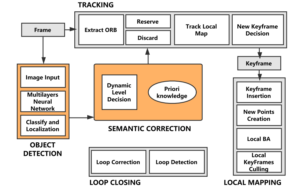 图2 Dynamic-SLAM系统的简要架构。它揭示了新添加模块与现有三个核心模块之间的关联关系。通过目标检测模块和语义校正组件有效地消除动态物体的影响。
