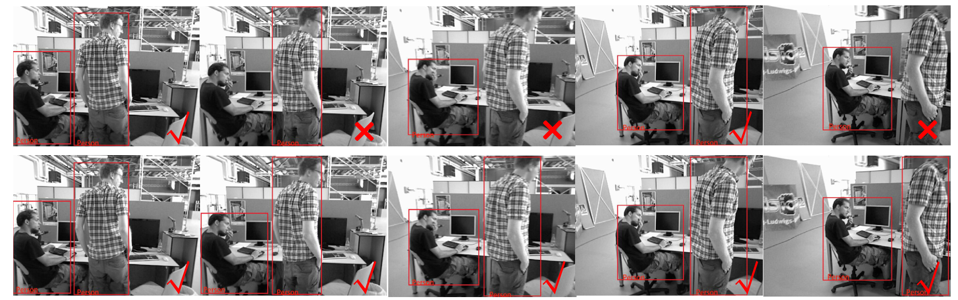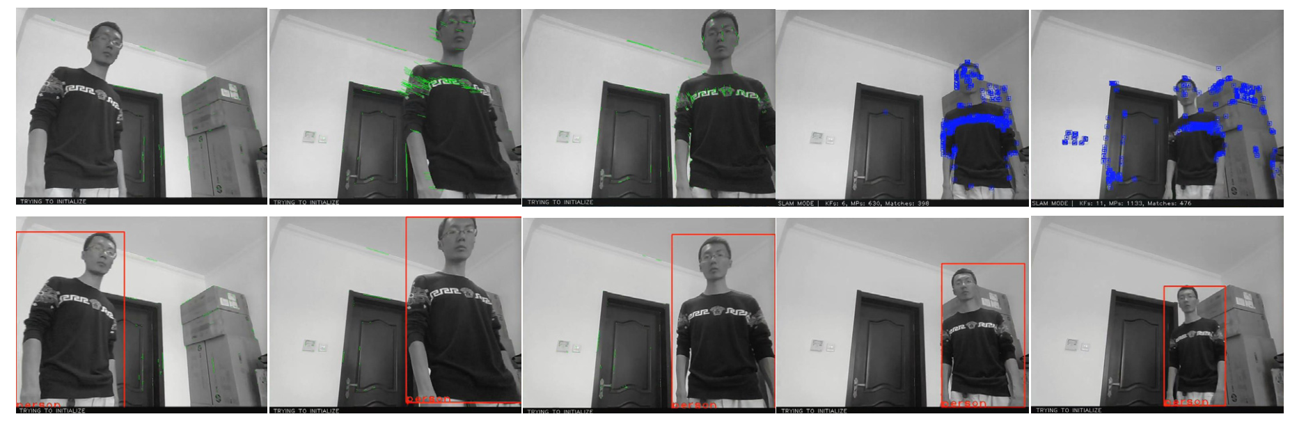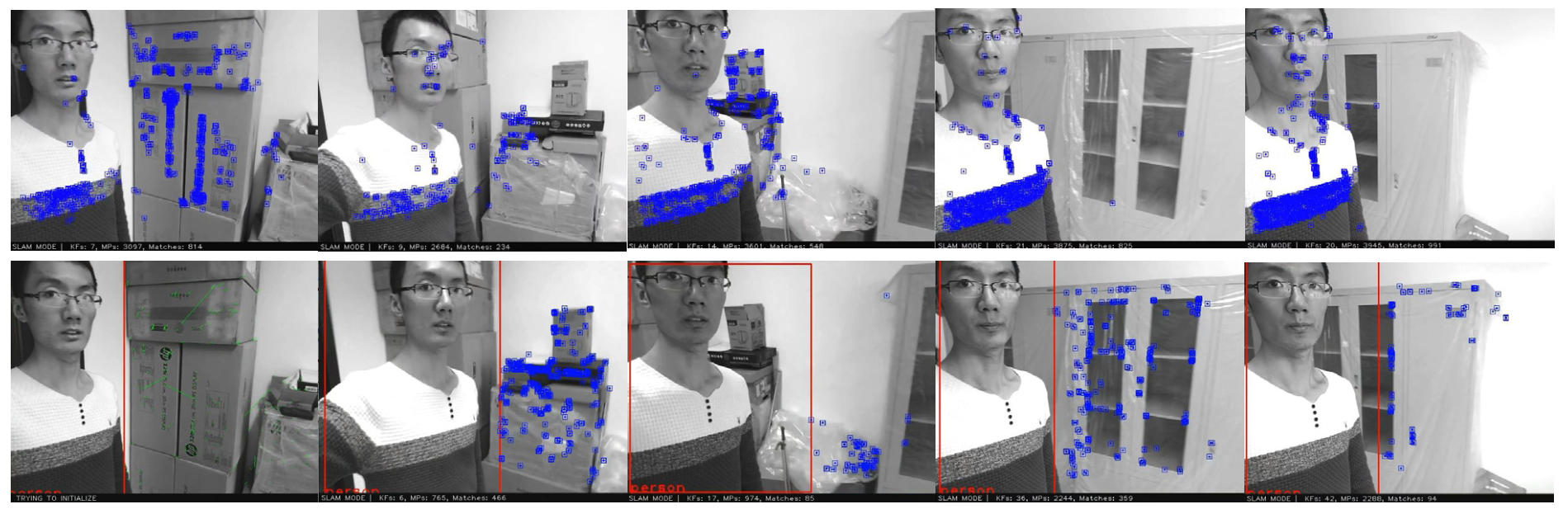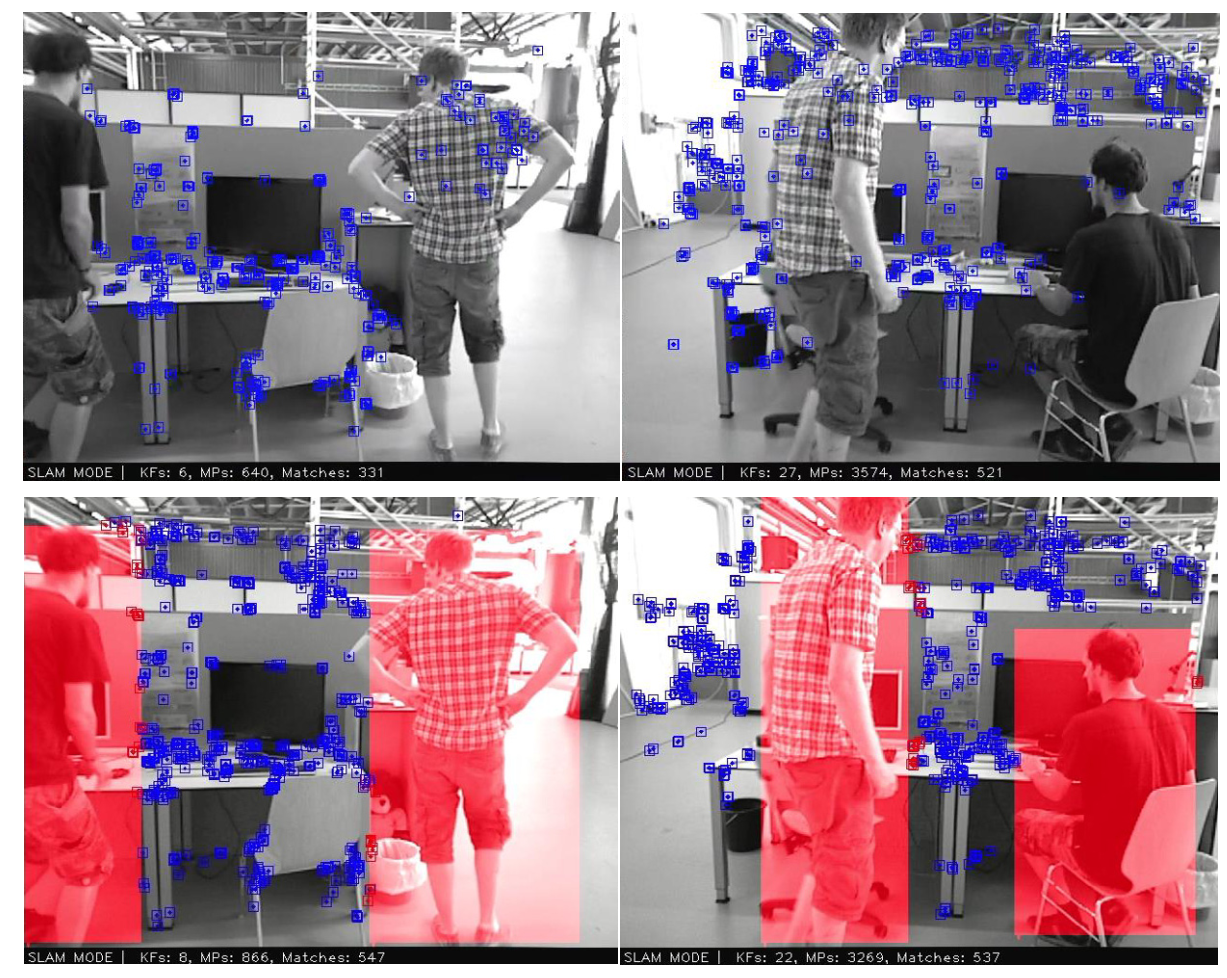 图7. ORB-SLAM2(上方)和Dynamic-SLAM(下方)在抗动态物体干扰时的特征提取。