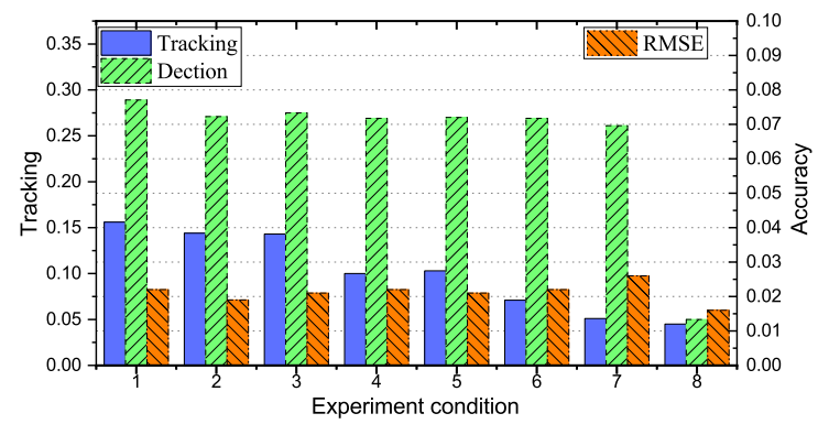 **图16. 采用TUM RGB-D基准数据集中的动态场景序列walking_xyz升级提升后进行测试与评估。该序列经过跟踪、检测以及均方根误差(RMSE)的变化分析。在GPU上未对检测过程进行优化。为了获得稳定结果,在每一次优化过程中进行了三次实验并计算三次实验结果的平均值作为最终评估指标。
