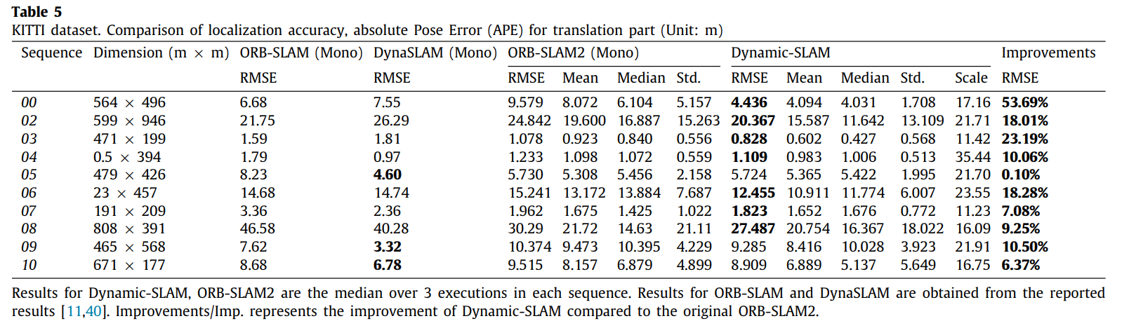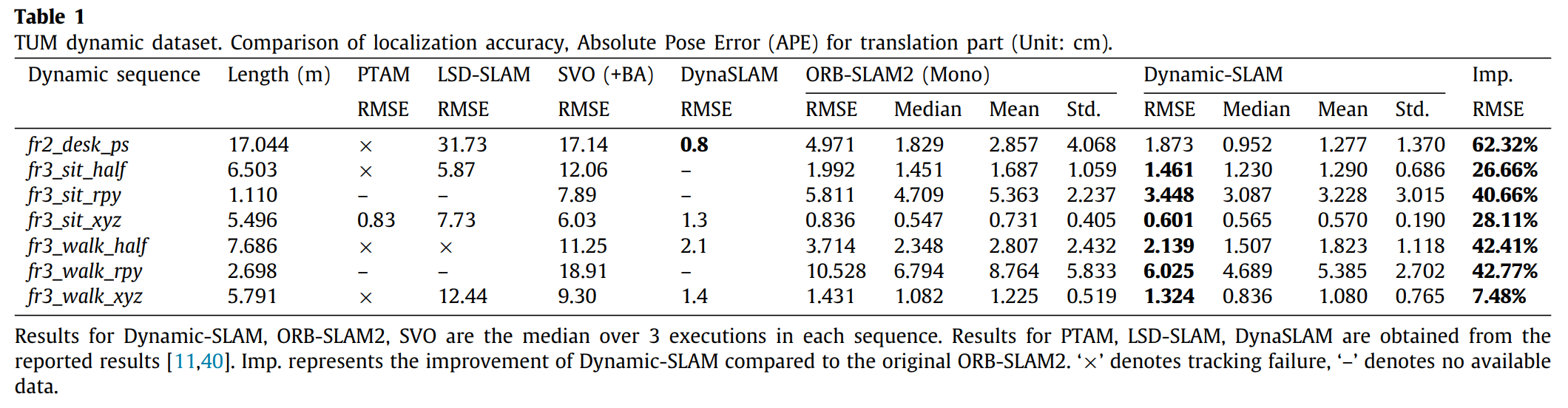 其中κ代表改进程度(或改进幅度),γ源自ORB-SLAM2算法中的参数设置;而λ则源自Dynamic-SLAM动态优化机制中的参数配置。对于每一个测试序列,在三次独立运行中对轨迹Root Mean Square Error(RMSE)误差进行比较分析以评估方法性能表现。
