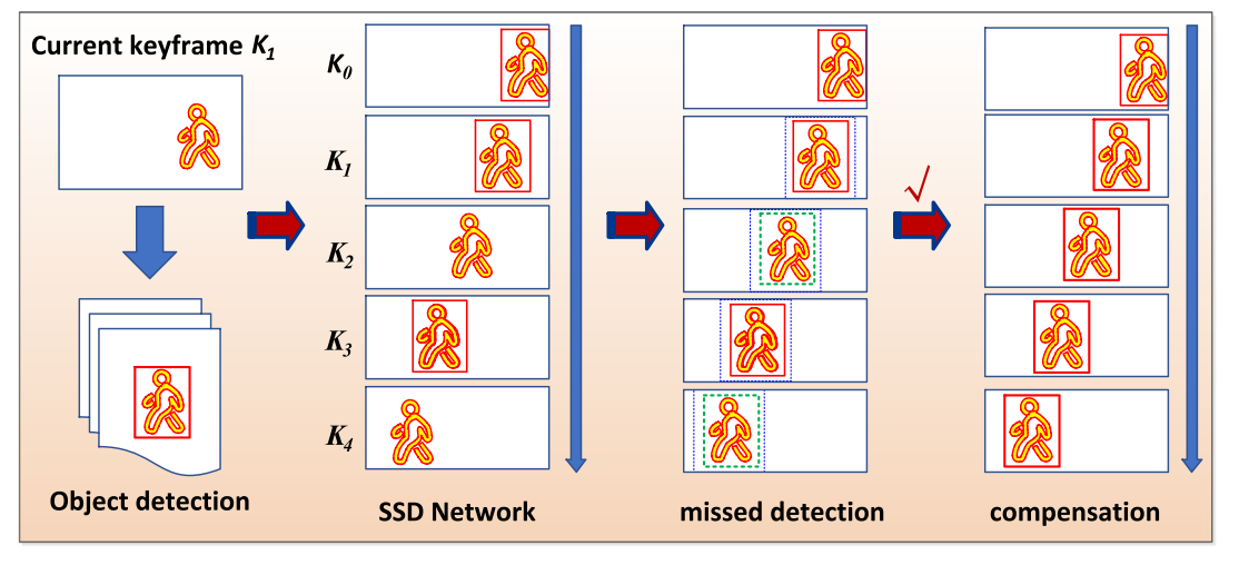 图3展示了遗漏检测补偿算法的工作原理示意图。其中用红色边界框标注了SSD网络检测到的目标区域。该算法首先根据设定的阈值 amax(用蓝色虚线框标注)进行判断;随后利用速度不变性假设计算出相应的补偿结果(用绿色虚线框标示)。对于本图表中的颜色标记,请参见文章的网络版本