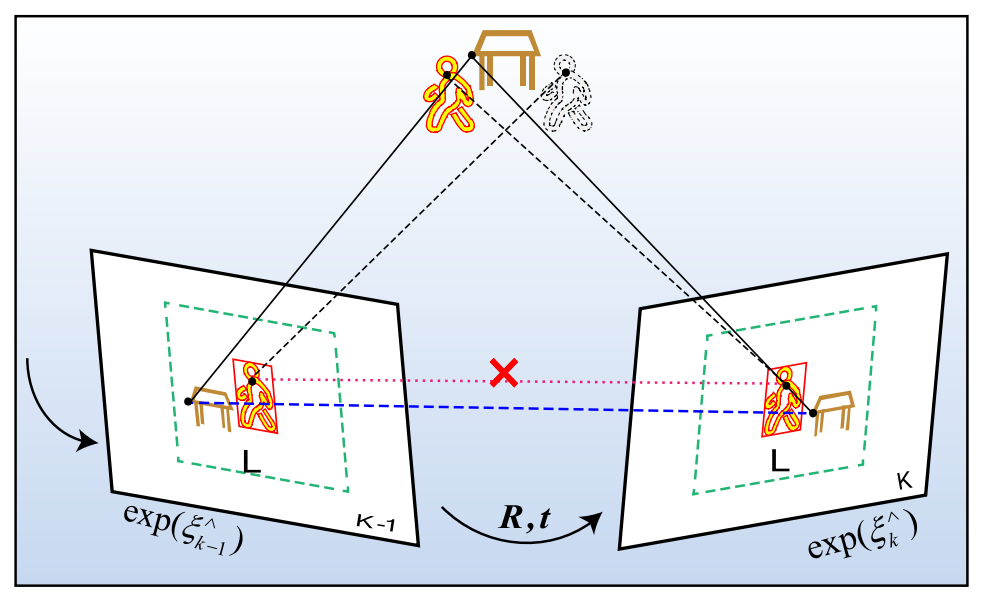 在机器人应用领域中,摄像头视野中通常会遇到动态物体的存在情况。当这些动态物体相对于环境发生移动时,传统的SLAM系统便难以准确识别并确定应采用哪些特征参数来实现自身运动的估计