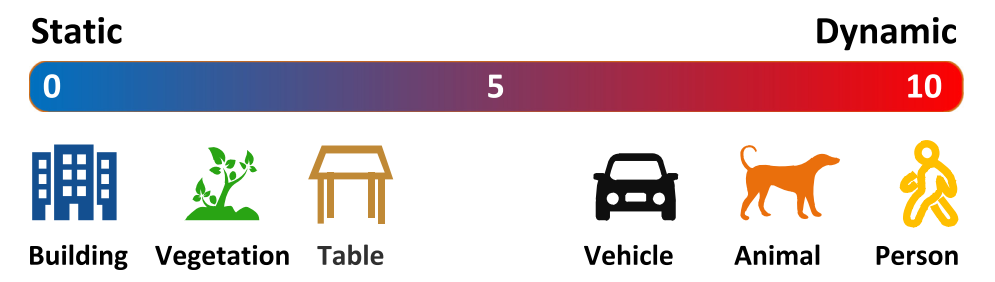 环境物体的语义概念是人类基于经验对环境的认识。当记忆陌生环境时,在先验知识的支持下会自动过滤掉车辆、行人等动态物体,并识记建筑物、植被等静态物体会更加清晰。若SLAM系统无法从语义层面解析周围环境,则无法实现对动态与静态物体会区分开来;仅能在短时间内识别出移动物体会导致长期一致性难以维持。因此,在结合目标检测结果的基础上运用先验知识,在语义层面上可执行动态物体现在判定模型设计中。对于Dynamic-SLAM系统而言,在前端SSD目标检测模块输出信息中存在冗余部分;它仅需明确所检特征点属于静态还是动态便足够了;根据人类认知基础可将目标运动特性打分为从0分(静止)到10分(运动)之间的一个分数值;该分数值须与预先设定阈值进行比较分析才能实现特征点运动特性的分类判别;在0至10分区间内常见物体会对应的近似得分情况如图4所示。
