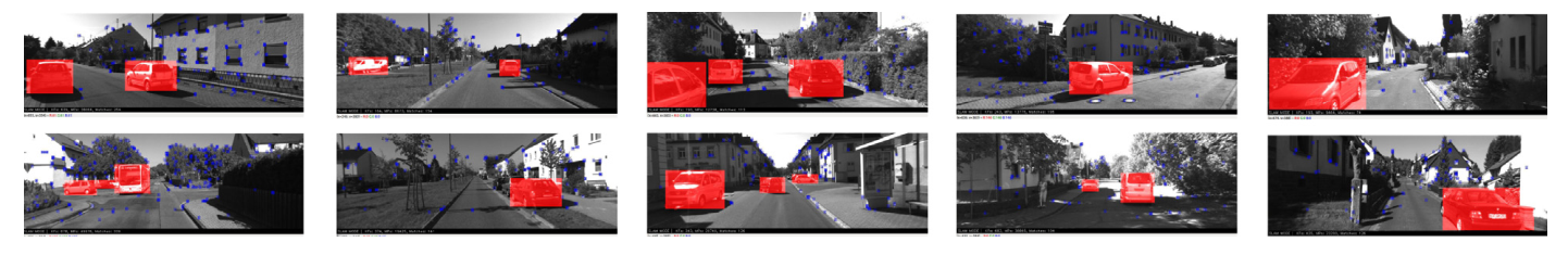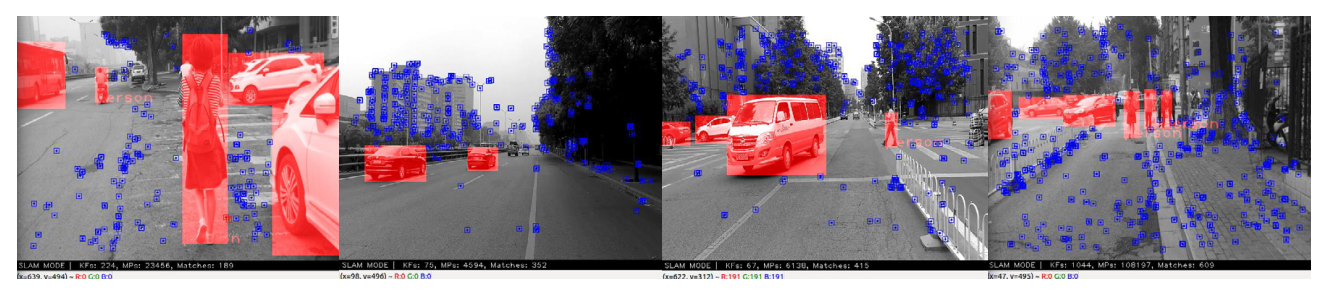 在使用KITTI数据集进行测试的过程中,在线展示了Dynamic-SLAM算法所生成的实时图像效果。其中被红色掩模覆盖的对象均为动态物体,在这种情况下包含了汽车、行人等多种类型的人体运动物体。这些物体表面分布着许多特征点,在定位精度与全局地图构建方面均受到了显著影响。(对于图例中颜色的解释,请参阅本文章的网络版本。)