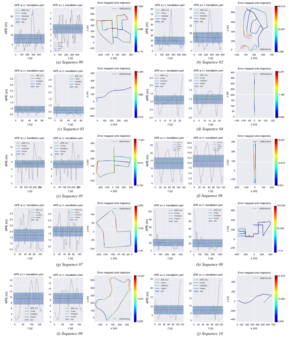 图14. 使用Sim(3) Umeyama方法对KITTI数据集中每个动态序列的绝对位姿误差进行了详细展示,并将这些误差绘制在轨迹图上。对于数据集中的每个序列片段, 左侧展示了ORB-SLAM2在平移部分上的绝对位姿误差曲线(单位: 米),中间展示了Dynamic-SLAM在平移部分上的绝对位姿误差曲线(单位: 米)。右侧则绘制了与地面真实轨迹(虚线)对比的绝对位姿误差曲线,并用色条表示各点的误差范围。由于轨迹图中各曲线的变化幅度较小,在此不做进一步比较分析;而对于左侧和中间子图中的数据, Dynamic-SLAM的表现均优于ORB-SLAM2