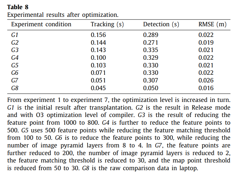 移植到机器人平台后,处理速度因低性能CPU和GPU导致提升了一倍多(具体数值分别为0.156秒与0.045秒)。为验证算法实时性,采用动态场景Walking_xyz来自TUM RGB-D基准数据集进行测试,评估结果显示于表8中,具体实验曲线可见图16。当优化级别提高时,跟踪效率随之增强,最终效果接近于笔记本电脑的水平。虽然精度有所下降但影响较小。综合来看,移植后的性能表现与原有设备基本持平