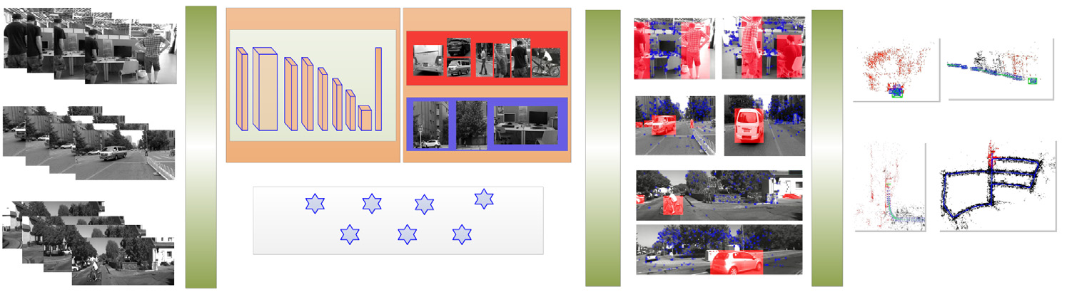 一个基于特征提取的视觉动态 SLAM 系统被成功构建出来。该系统以 SSD 卷积神经网络为基础,在深度学习技术的基础上实现了机器人定位与建图中对动态物体进行语义级别检测的功能,并充分结合了先验知识以进一步优化了系统的性能。