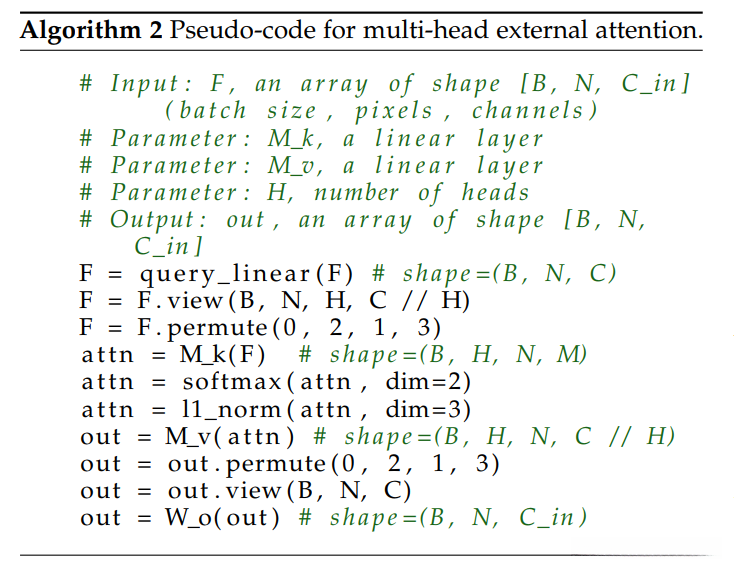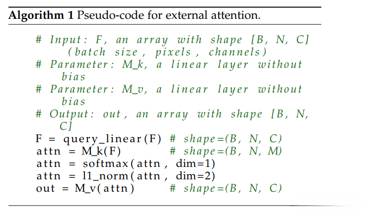 算法 1 中列出了用于外部注意力的 python 样式的伪代码。