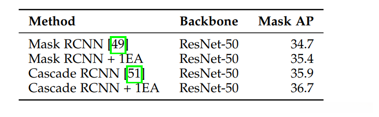 表 4 COCO 实例分割数据集的实验。引用的结果来自[47]。掩码 AP:掩码平均精度