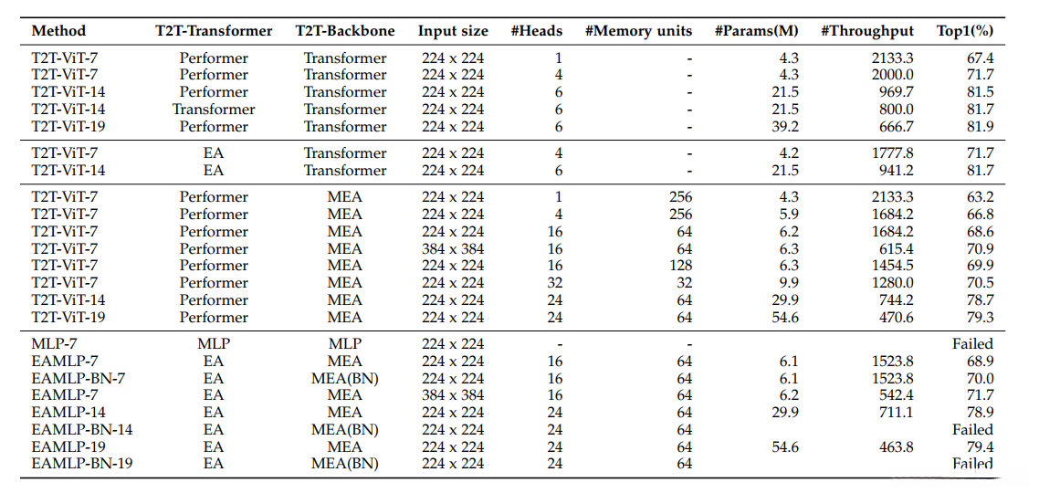 表 2 ImageNet 上的实验。 Top1:top1 精度。 EA:外部注意力。 MEA:多头外部注意力。 EAMLP:提出了所有的 MLP 架构。Failed:无法收敛。 EAMLP-BN:在 T2T-ViT 主干的 MLP 块(不是外部注意力块)中用 BN 替换 LN。