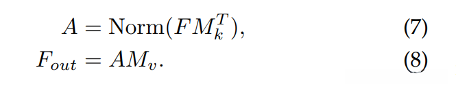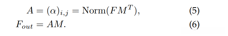 与self-attention不同,式(5)中的αi,j是M的第i个像素和第j行的相似度,其中M是一个独立于输入的可学习参数,充当整体的记忆训练数据集。 A 是从这个学习到的数据集级先验知识推断出的注意力图;它以类似于自我注意的方式进行归一化(参见第 3.2 节)。最后,我们通过 A 中的相似性来更新 M 中的输入特征。
