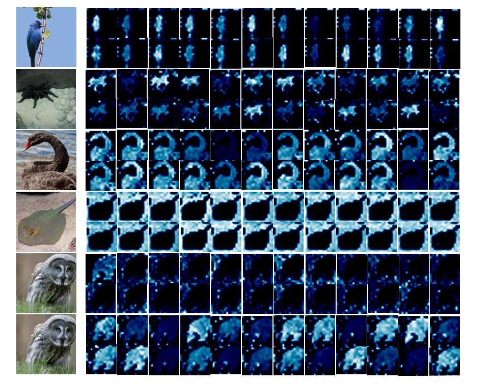 图 5. ImageNet 验证集上 EAMLP-14 最后一层的多头注意力图。左:输入图像 其他:EAMLP-14 最后一层的 24 个头部注意力图,用于 ImageNet 验证集。最后两行:注意两行不同的 Mk 到图像块