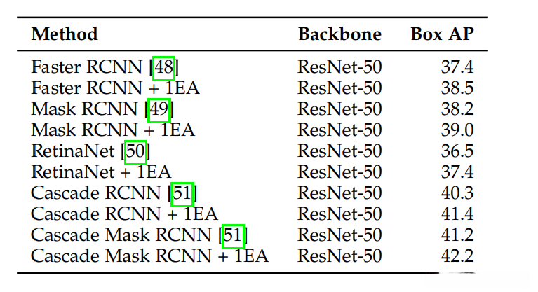 MMDetection [47] 是一个广泛使用的对象检测和实例分割工具包。我们使用带有 RestNet-50 主干的 MMDetection 进行了对象检测和实例分割实验,应用于 COCO 数据集。我们只在 Resnet 第 4 阶段结束时添加了外部关注。结果在表 3 和表4 表明,外部注意力为对象检测和实例分割任务带来了 1% 的准确性提高。