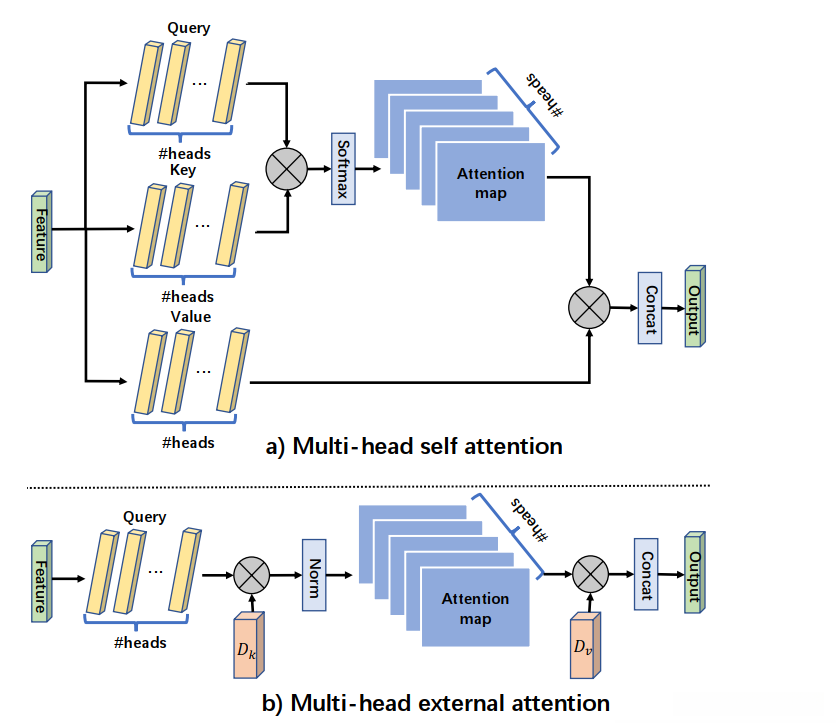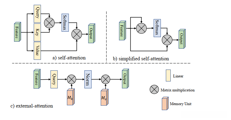 与自我注意不同,自我注意通过计算自我查询和自我关键字之间的亲和度来获得注意图,而我们的外部注意计算自我查询和更小的可学习关键字记忆之间的关系,后者捕获数据集的全局上下文。外部注意力不依赖于语义信息,可以通过端到端的反向传播算法进行优化,而不需要迭代算法。