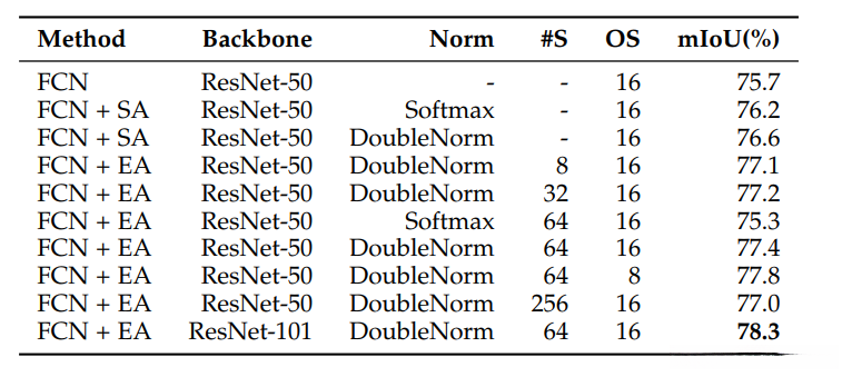 表 1 PASCAL VOC val 集的消融研究。Norm:注意力中的归一化方法。 #S:内存单元中的元素数。 OS:主干的输出步幅。 FCN [46]:全卷积网络。 SA:自我关注。 EA:外部注意力。 DoubleNorm:归一化描述为等式 9