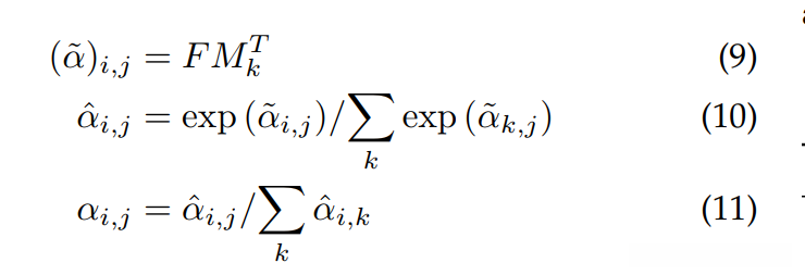 在 self-attention 中使用 Softmax 对注意力图进行归一化,使得 Pj αi;j = 1。然而,注意力图是通过矩阵乘法计算的。与余弦相似度不同,注意力图对输入特征的规模敏感。为了避免这个问题,我们选择了[42]中提出的双重归一化,分别归一化列和行。这种双重归一化被表述为: