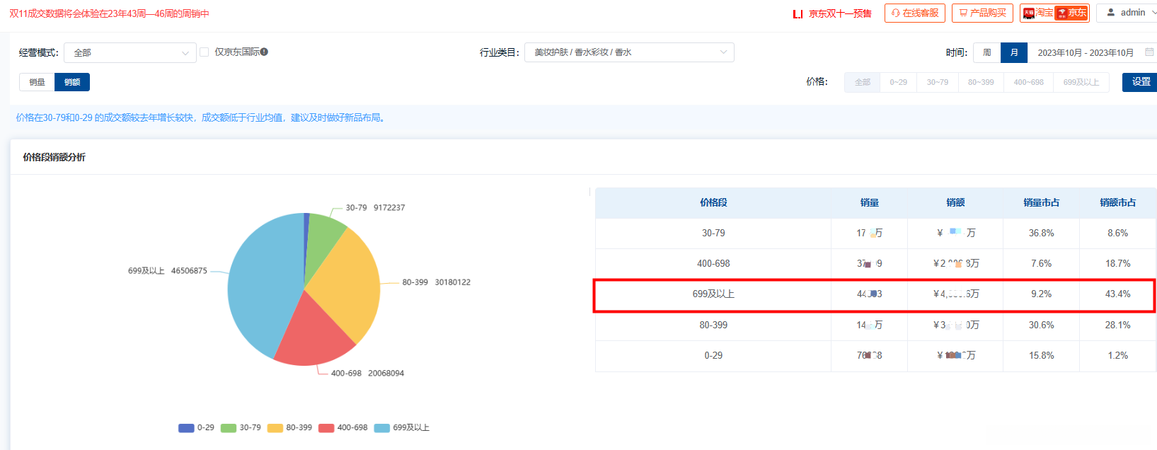就消费端而言,在奢侈品香水市场上仍具有较强的吸引力。通过对香水市场各价位段的分析可以看出:699元及以上价位带的商品成交额占比高达43%,远高于其他价位带的市场份额