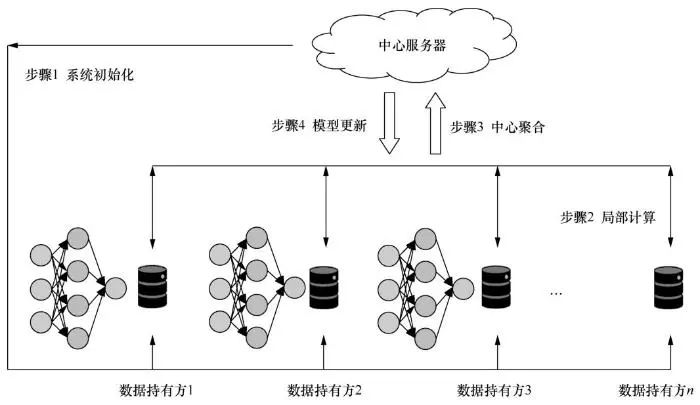 步骤3:中心聚合。当多个数据提供方提交计算结果时,在接收阶段,中心服务器将执行整合操作以完成数据汇总,在整合过程中需兼顾效率、安全性及隐私保护等多个维度。值得注意的是,在某些情况下(如系统存在异构特性),为了提高处理效率或减少资源消耗,中心服务器可能会选择一个适当的数据提供子集作为收集目标,并采用特定的安全技术对参数进行加密处理;此外,在实际操作中为了确保数据完整性与安全性通常会结合多种优化策略以达到最佳效果;这些优化方法将在后续章节中详细阐述