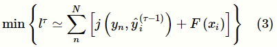 为了最小化目标函数所对应的损失值,在机器学习模型训练过程中使用泰勒二次展开的形式来近似预测残差的变化趋势:其中j(·,·)被定义为用于计算每个叶子节点上的具体损失的方法;而F(x)则代表了预测残差的一阶与二阶导数之总和。为了防止模型出现过拟合现象,在构建损失函数时需引入正则项: