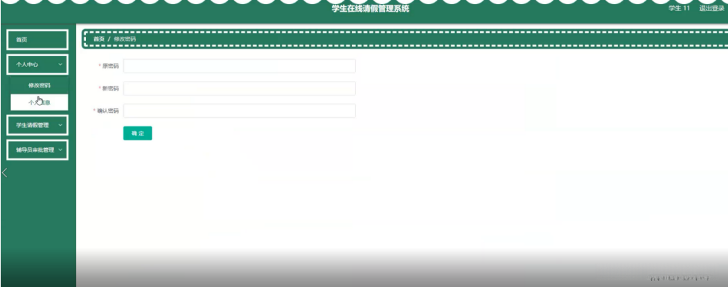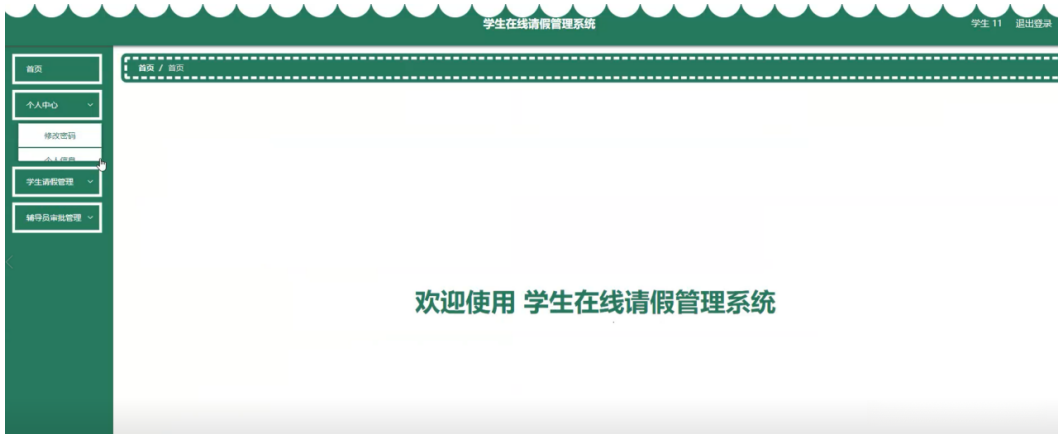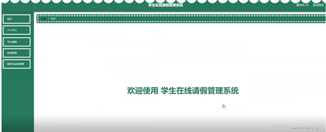 学生登录进入系统后可以对首页、个人中心、学生请假管理、辅导员审批管理等进行相应操作,如图5-10所示。