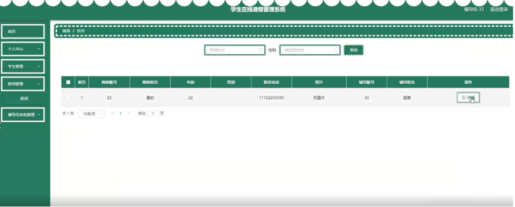 辅导员在教师管理页面查看教师账号、教师姓名、年龄、性别、联系电话、照片、辅导账号、辅导姓名等内容进行详情操作,如图5-23所示。