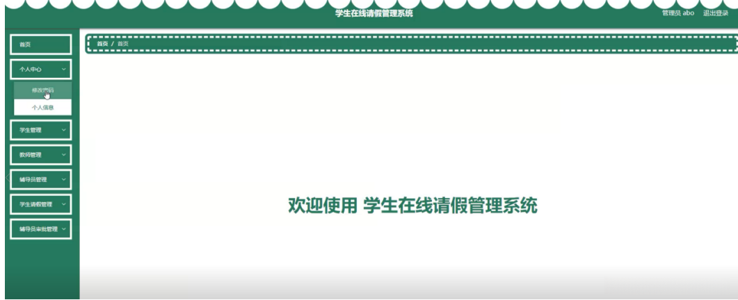 管理员登录系统后,可以对首页、个人中心、学生管理、教师管理、辅导员管理、学生请假管理、辅导员审批管理等进行相应的操作管理,如图5-2所示。