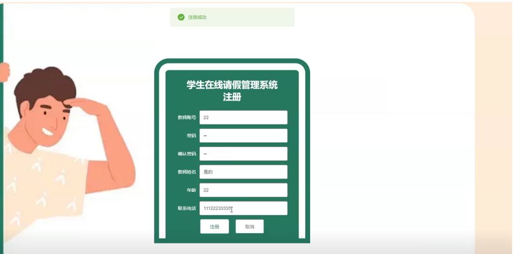 教师注册,在教师注册页面通过填写教师账号、密码、确认密码、教师姓名、年龄、联系电话等信息完成教师注册操作,如图5-14所示。