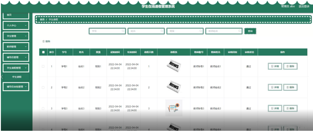 学生请假管理,在学生请假管理页面可以对学号、姓名、班级、起始时间、结束时间、请假天数、请假条、教师账号、教师姓名、审核回复、审核状态等内容进行详情和删除等操作,如图5-6所示。