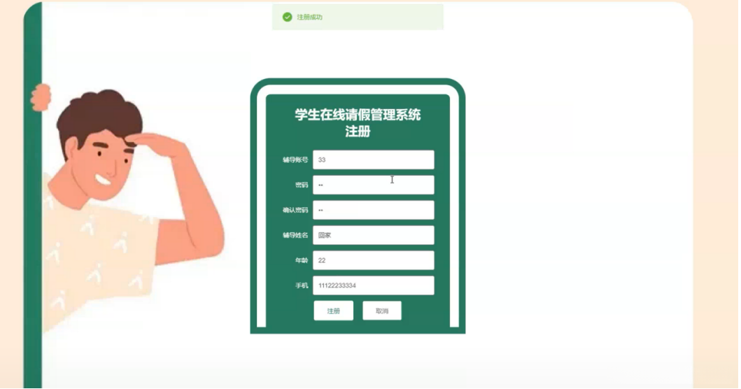 辅导员注册,在辅导员注册页面通过填写辅导账号、密码、确认密码、辅导姓名、年龄、手机等信息完成辅导员注册操作,如图5-19所示。