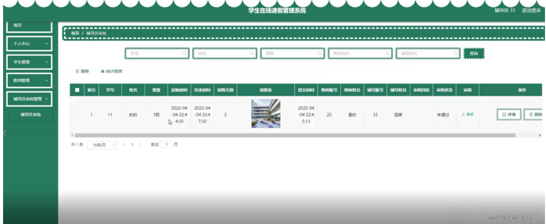 辅导员在辅导员审批管理查看学号、姓名、班级、起始时间、结束时间、请假天数、请假条、提交时间、教师账号、教师姓名、辅导账号、审核回复、审核状态、审核等内容进行详情、删除操作,如图5-24所示。