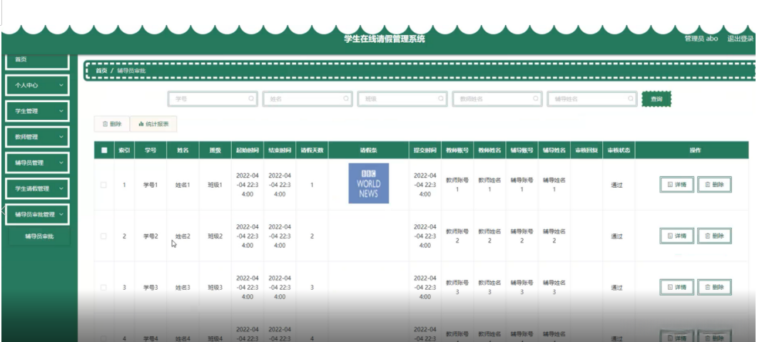 辅导员审批管理,在辅导员审批管理页面可以对学号、姓名、班级、起始时间、结束时间、请假天数、请假条、提交时间、教师账号、教师姓名、辅导账号、审核回复、审核状态等内容进行详情和删除等操作,如图5-7所示。
