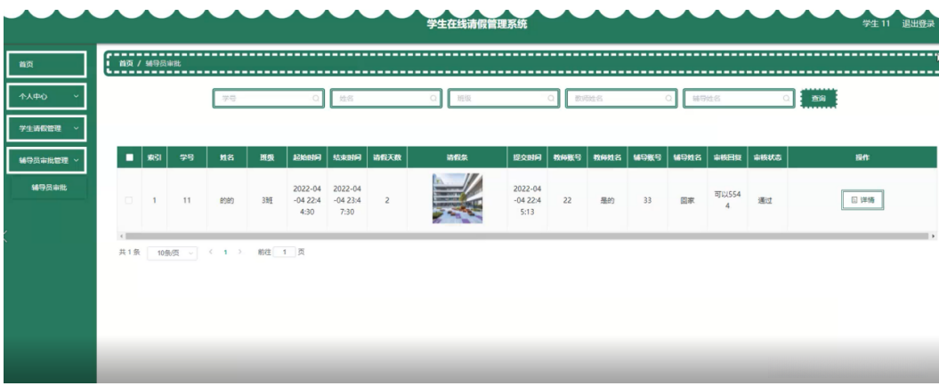 学生在辅导员审批管理页面查看学号、姓名、班级、起始时间、结束时间、请假天数、请假条、提交时间、教师账号、教师姓名、辅导账号、审核回复、审核状态等内容进行详情操作,如图5-13所示。