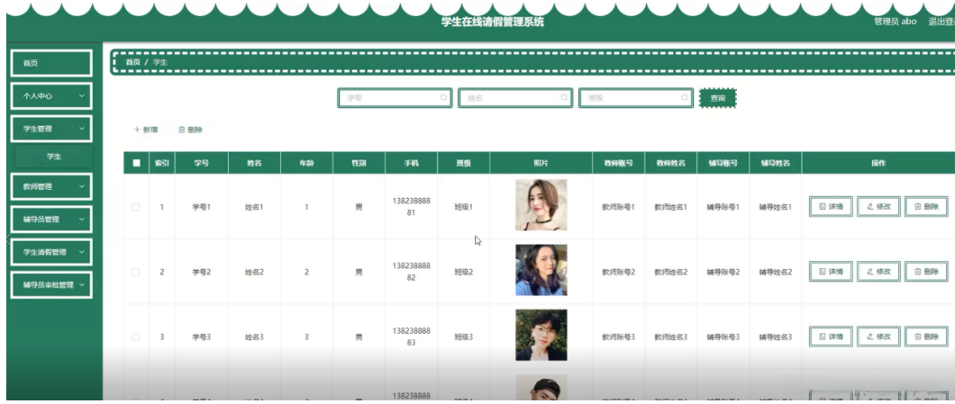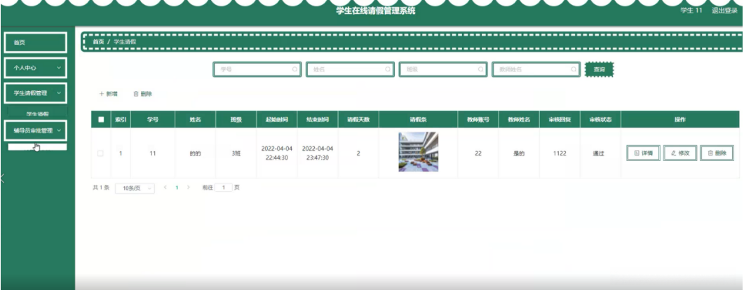 图5-12学生请假管理界面图