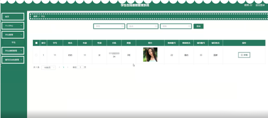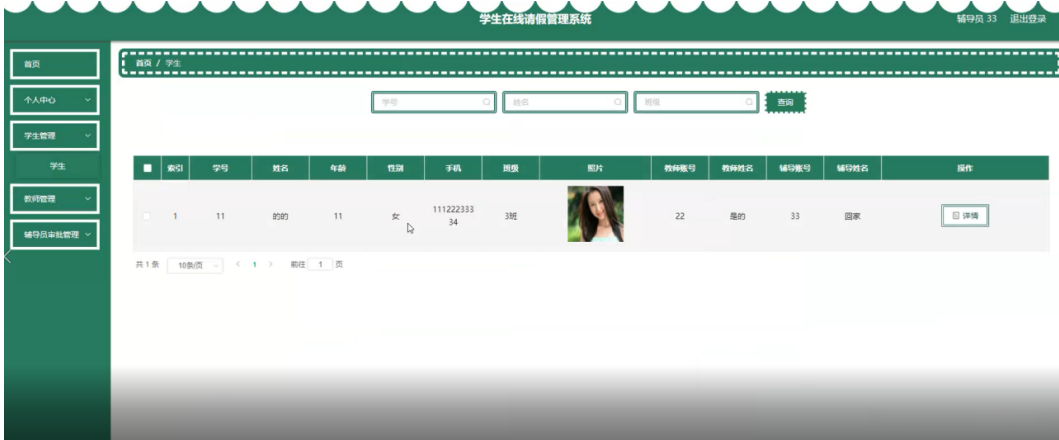 辅导员在学生管理页面查看学号、姓名、年龄、性别、手机、班级、照片、教师账号、教师姓名、辅导账号、辅导姓名等内容进行详情操作,如图5-22所示。