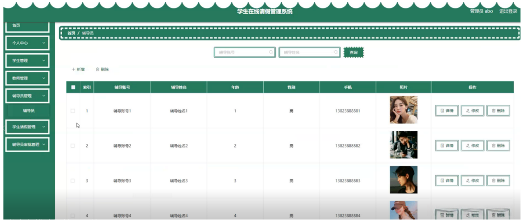 辅导员管理,在辅导员管理页面可以对辅导账号、辅导姓名、年龄、性别、手机、照片等内容进行详情、修改和删除等操作,如图5-5所示。