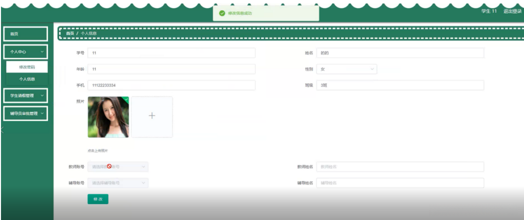 用户在个人中心页面填写学号、姓名、年龄、性别、手机、班级、照片等内容,进行修改,还能修改密码,如图5-11所示。
