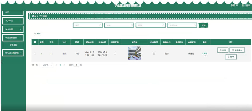 教师在学生请假管理页面查看学号、姓名、班级、起始时间、结束时间、请假天数、请假条、教师账号、教师姓名、审核回复、审核状态等内容进行详情、请假提交、删除操作,如图5-18所示。