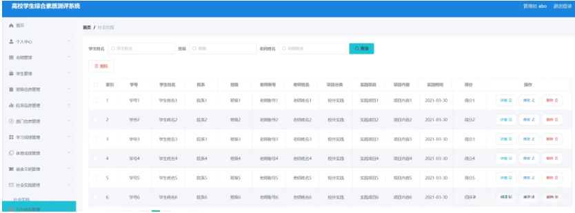 社会实践管理,在社会实践管理页面中可以查看索引、学号、学生姓名、院系、班级、老师账号、老师姓名、项目分类、实践项目、项目内容、实践时间、得分等信息,并可根据需要进行详情,修改或删除等操作,如图5-9所示。