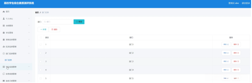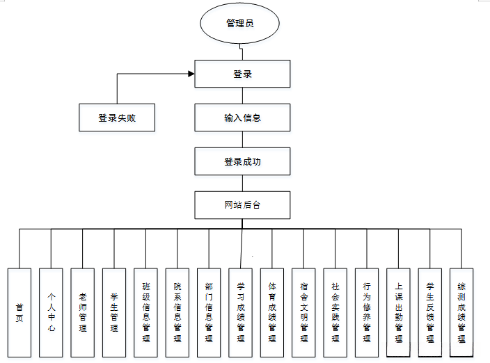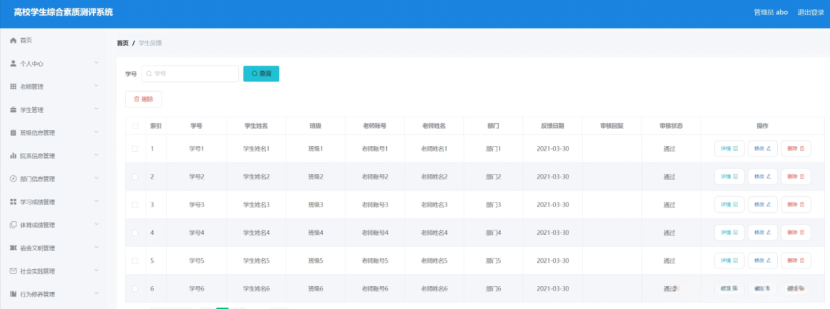 (1)功能要求:可以管理首页、个人中心、老师管理、学生管理、班级信息管理、院系信息管理、部门信息管理、学习成绩管理、体育成绩管理、宿舍文明管理、社会实践管理、行为修养管理、上课出勤管理、学生反馈管理、综测成绩管理等功能模块。