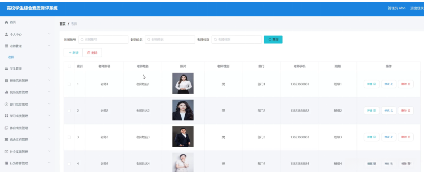 老师管理,在老师管理页面中可以查看索引、老师账号、老师姓名、照片、老师性别、部门、老师手机、班级等信息,并可根据需要进行详情,修改或删除等操作,如图5-3所示。