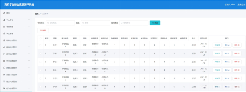 行为修养管理,在行为修养管理页面中可以查看索引、学号、学生姓名、院系、班级、老师账号、老师姓名、热爱国家、尊敬守法、文明礼貌、关系集体、刻苦学校、尊重他人、诚实可信、自尊自爱、总计、评定时间等信息,并可根据需要进行详情,修改或删除等操作,如图5-10所示。