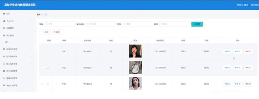 学生管理,在学生管理页面中可以查看索引、学号、学生姓名、性别、照片、学生手机、班级、院系等信息,并可根据需要进行详情,修改或删除等操作,如图5-4所示。