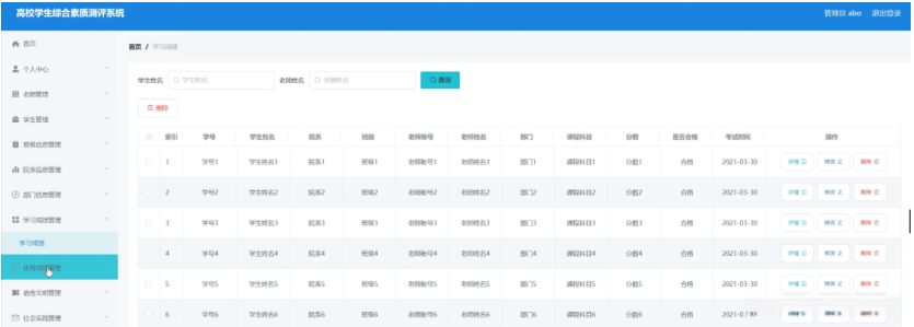 学习成绩管理,在学习成绩管理页面中可以查看索引、学号、学生姓名、院系、班级、老师账号、老师姓名、部门、课程科目、分数、是否合格、考试时间等信息,并可根据需要进行详情,修改或删除等操作,如图5-8所示。