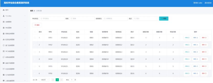 3、功能的完善性:可以管理首页、个人中心、老师管理、学生管理、班级信息管理、院系信息管理、部门信息管理、学习成绩管理、体育成绩管理、宿舍文明管理、社会实践管理、行为修养管理、上课出勤管理、学生反馈管理、综测成绩管理模块的修改维护操作。
