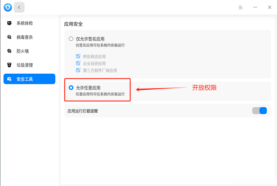 安装可能会失败,因为我们制作的安装包是非官方的安装包,需要到安全中心去勾选上允许任意应用安装,