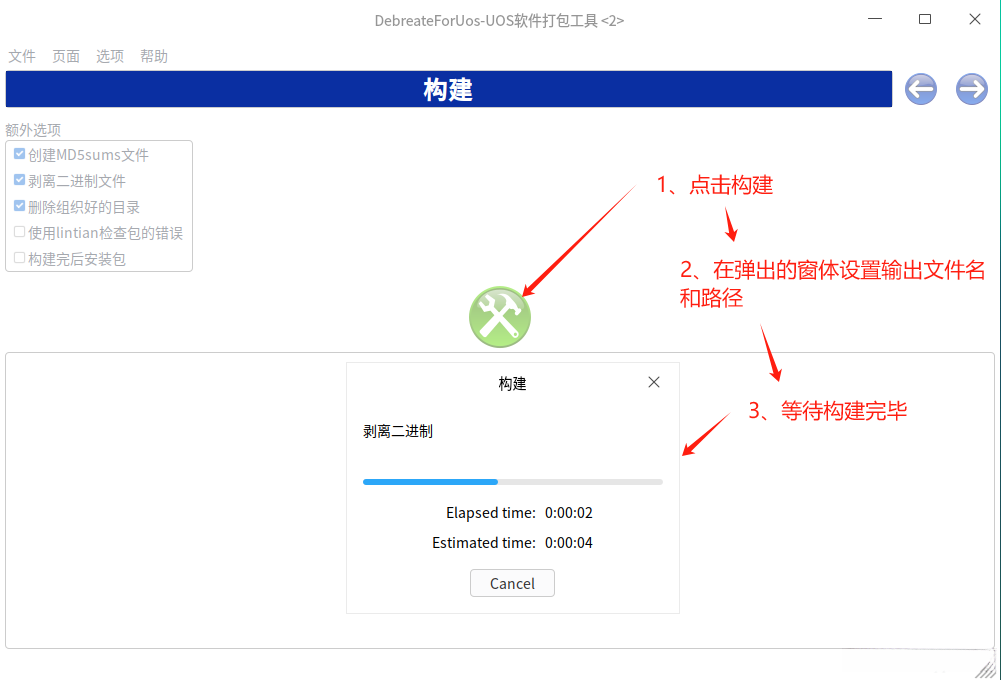 之后就直接下一步到最后一个页面了,其间的步骤都不是必要的,所以直接到下一步执行构建打包,所有配置都按默认的,直接点击构建按钮,点击构建后会让选择构建输出的目录和要输出的文件名