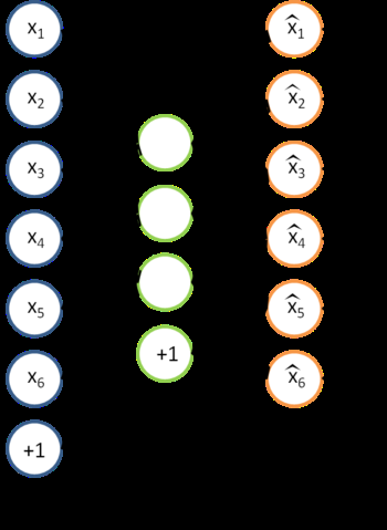 利用训练得到的模型参数 W^{(1)}, b^{(1)}, W^{(2)}, b^{(2)},给定任意的输入数据 x,可以计算隐藏单元的激活量(activations)a。如前所述,相比原始输入 x 来说,a 可能是一个更好的特征描述。下图的神经网络描述了特征(激活量 a)的计算。